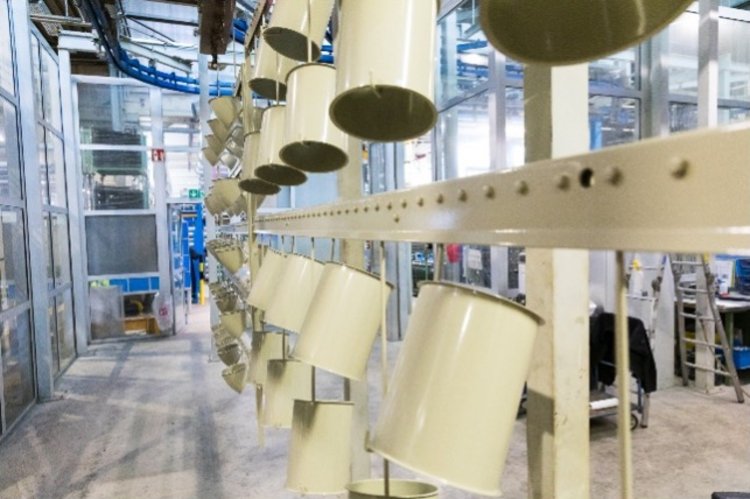 Nach dem Trocknen kommt Farbe ins Spiel: Die Rohrteile werden mit Pulver beschichtet und bei 120 °C vorgewärmt. Was daneben geht? Saugen wir ab und nutzen es wieder – über 98 Prozent des Pulvers bleiben im Kreislauf!